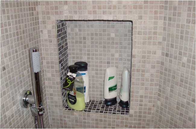 RIVESTIMENTO DOCCIA E NICCHIA IN MOSAICO DI MARMO E MOSAICO DI VETRO